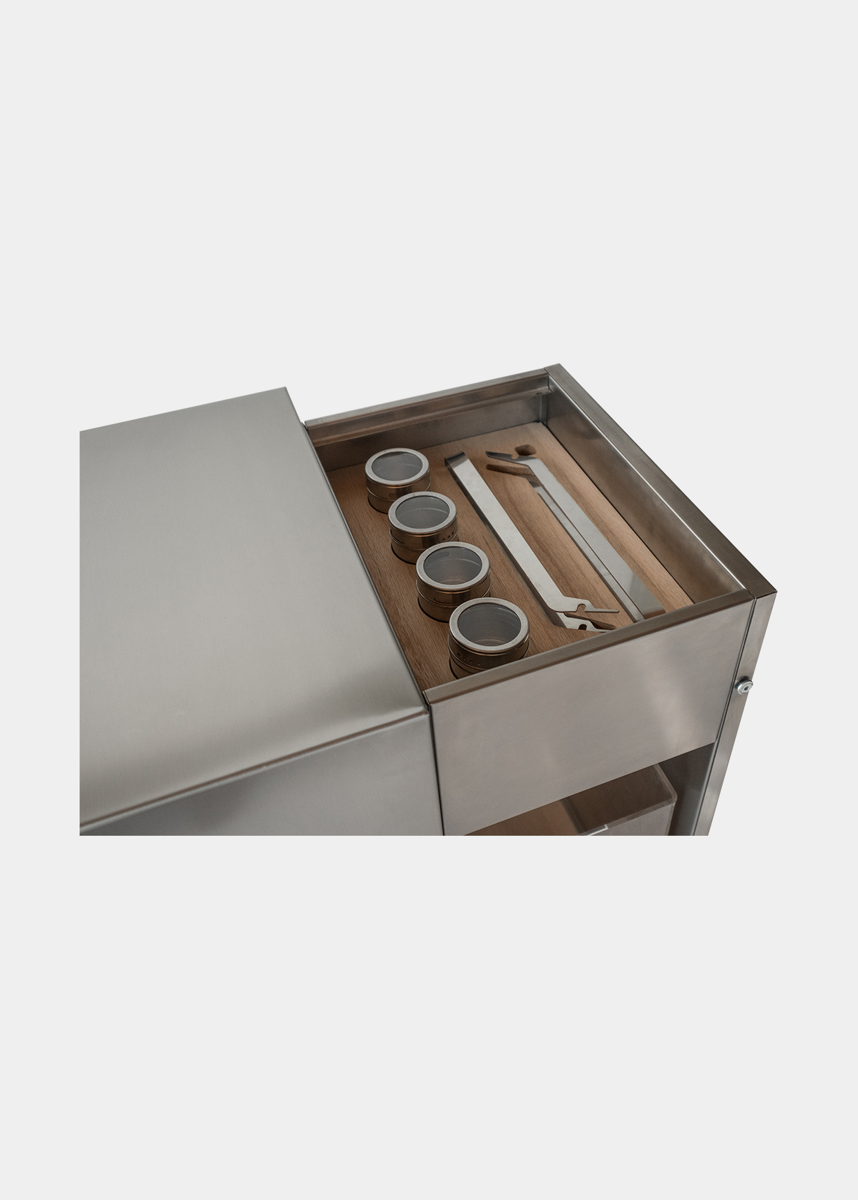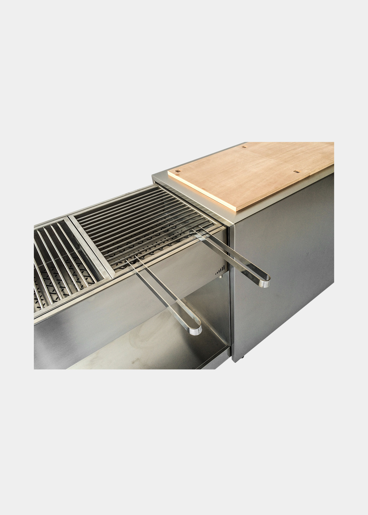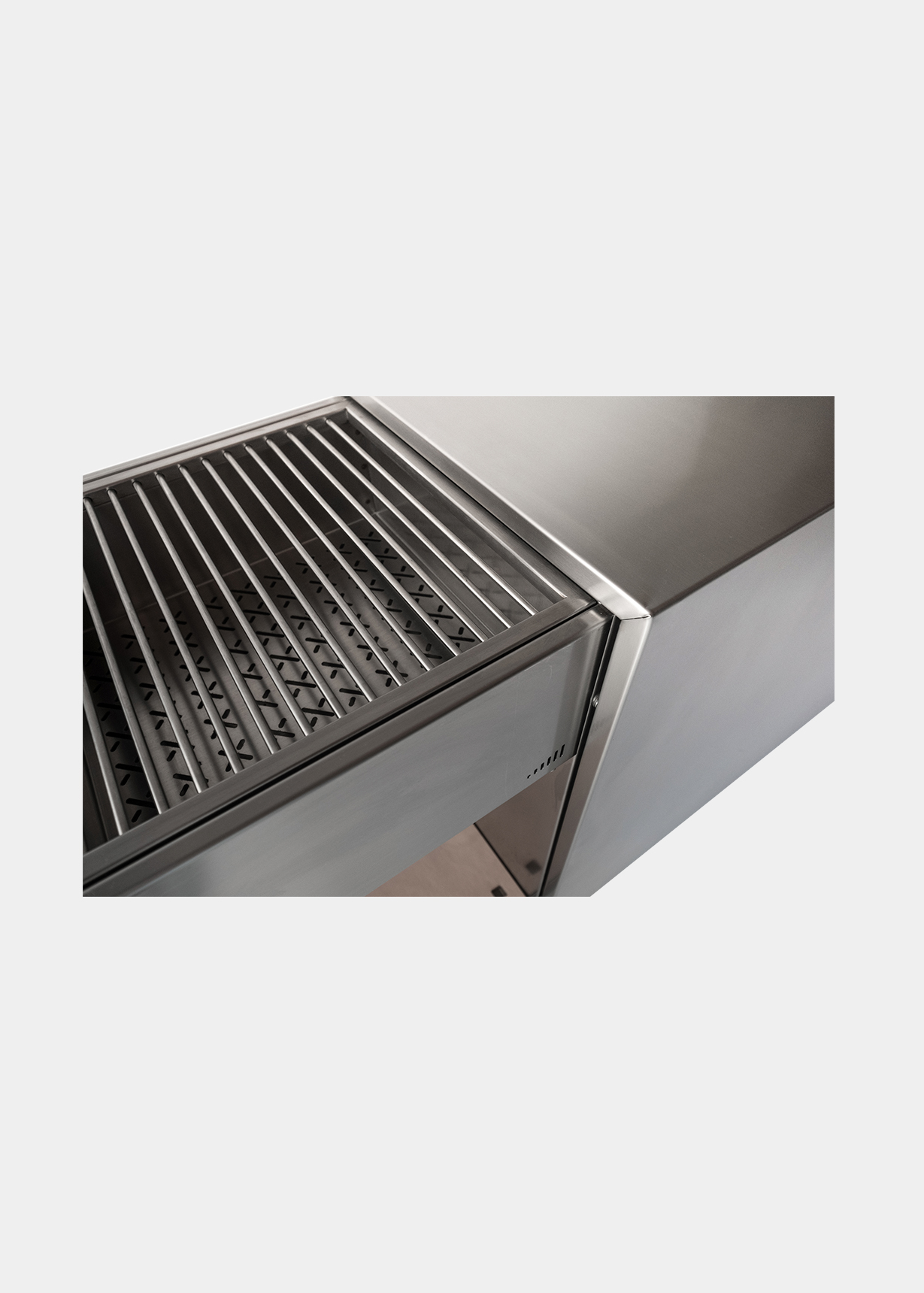 Barbecue a carbonella monolitico, elegante e funzionale con griglie e accessori scorrevoli a scomparsa.